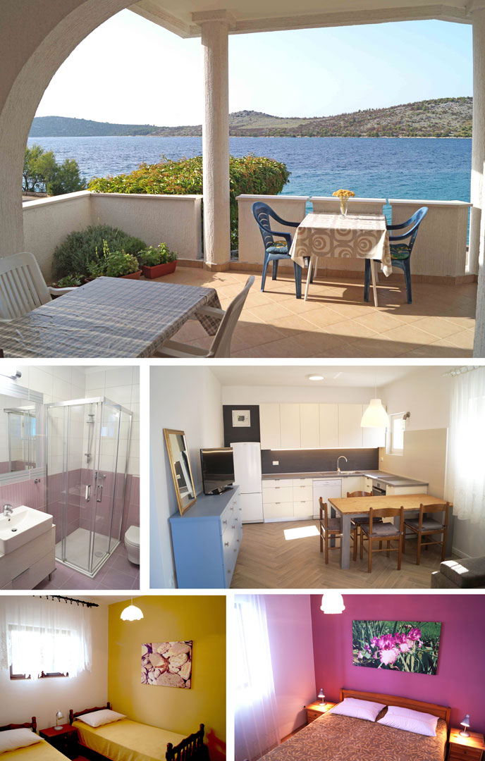 Kompletan apartman je 2017.g. novo najmodernije uređen. Nalazi se na srednjoj etaži. Ima 25m2 veliku natkrivenu terasu s direktnim pogledom na more, moderan dnevni boravak s kompletno oprenljenom stambenom kuhinjom (perilica za suđe, mikrovalna, aparat za kavu, toster), dvije spavaće sobe, svaka s po 2 kreveta, lijepo uređenu kupaonicu (tuš kada). U cijeni iznajmljivanja su ležaljke na plaži ispred kuće. Tijekom dana na plaži se izmjenjuju sunce i hlad.